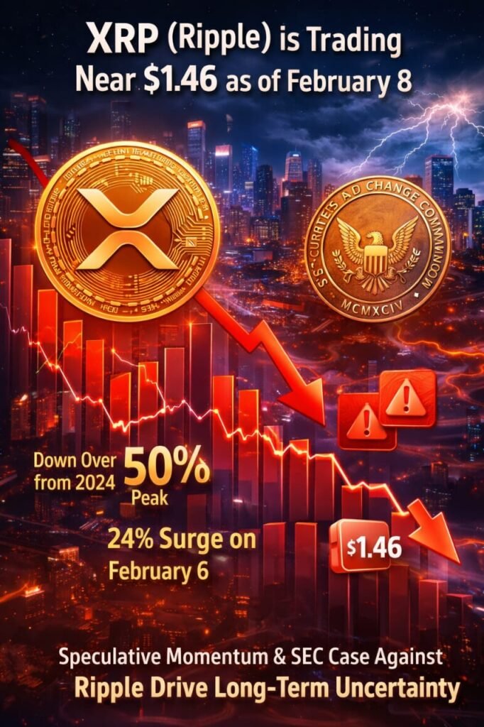 XRP (Ripple) is trading near $1.46 as of February 8. After rallying strongly through 2024 and peaking around $3.30, XRP has now fallen more than 50% from its high. A recent 24% price surge on February 6 aligned with a broader crypto market rebound rather than XRP-specific developments. Analysts caution that XRP’s valuation has been driven largely by speculative momentum, while regulatory outcomes particularly developments in the SEC’s case against Ripple remain key long term drivers.