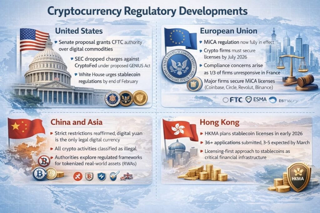 The European Union’s Markets in Crypto-Assets (MiCA) regulation is now fully in effect. Crypto companies operating in the EU must secure licenses by July 1, 2026. In France, regulators reported that nearly one-third of crypto firms have not yet responded to licensing inquiries, raising compliance concerns. At the same time, major firms such as Coinbase, Circle, and Revolut have already obtained MiCA approvals. Binance has applied for a pan-European MiCA license through its Greek subsidiary as it prepares for regulatory alignment. EU policymakers are also debating enhanced centralized supervision under the European Securities and Markets Authority (ESMA).