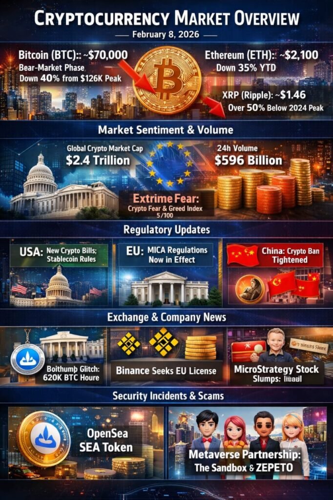 Ethereum (ETH) is trading near $2,000–$2,100, with prices around $2,068 on February 6 and approximately $2,119 by February 8. Ethereum has also declined significantly, down about 35% year-to-date, reflecting broader market weakness. While long-term optimism remains tied to network upgrades and growing institutional adoption, Ethereum’s short-term price action continues to closely track overall crypto market sentiment.